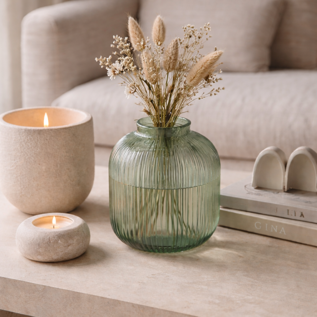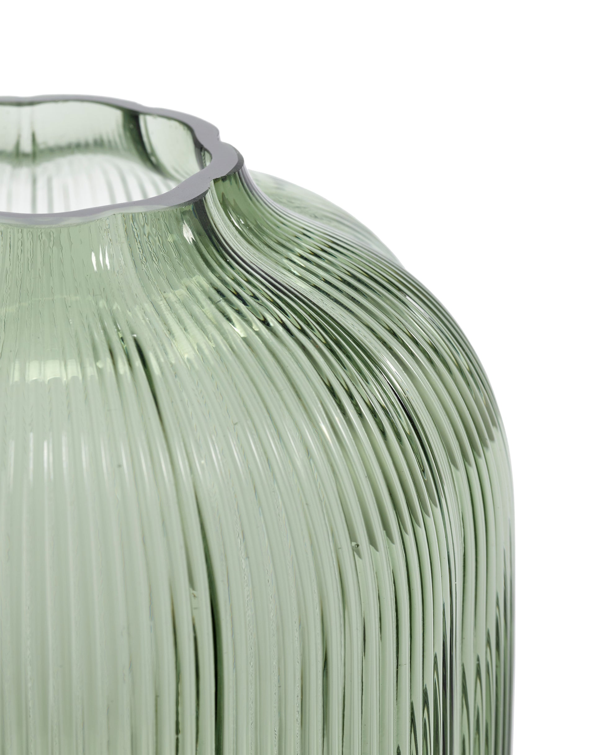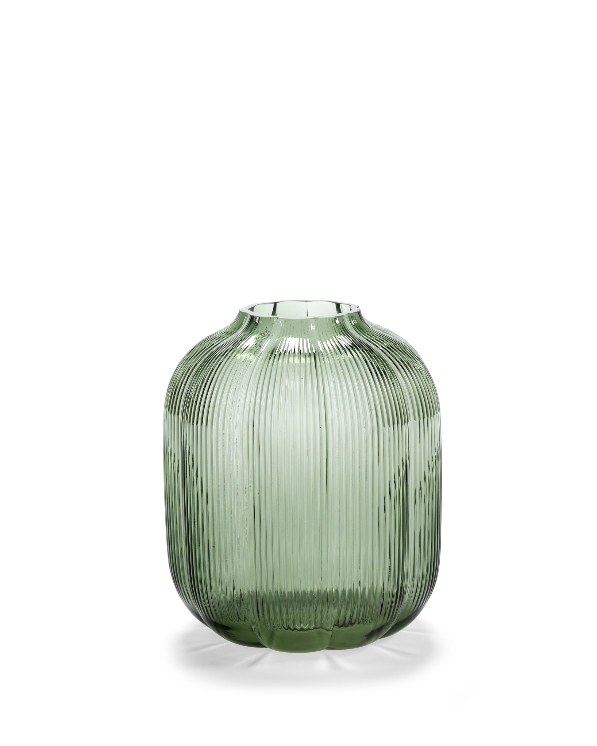 Deze elegante glazen vaas van Serax valt op door zijn zachte groene tint en verfijnde verticale ribbelstructuur. De ronde vorm en subtiel golvende rand geven de vaas een organische uitstraling, waardoor hij zowel met als zonder bloemen een stijlvol object in het interieur vormt.